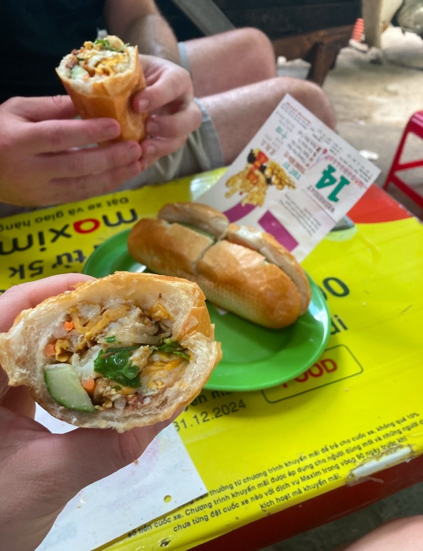 It was around about then that I started to get very hungry and we stopped at the most random street stall. Given it was day one, we were probably a bit ambitious going to a stall at which there were absolutely no English signs - but we got the banh mi!