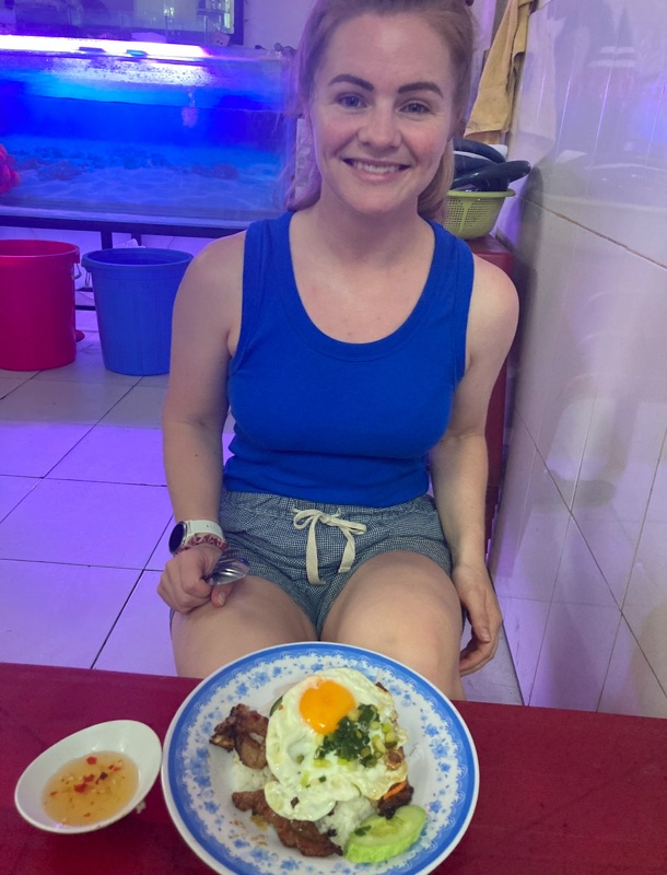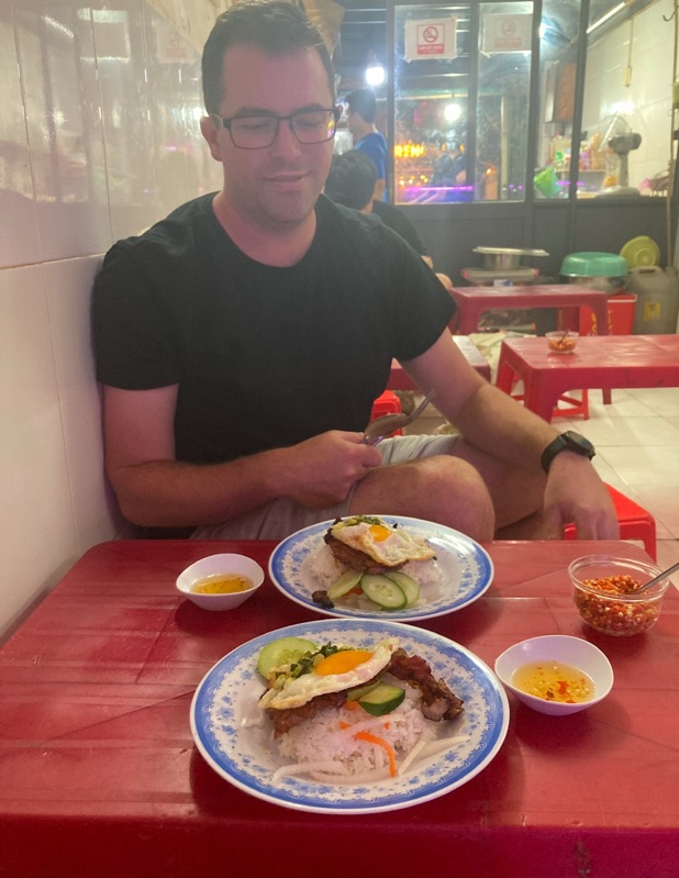 After a rest at the hotel (we had coveted a lot of ground on very little sleep), we headed out for dinner as per our hotel owners recommendation. She recommended a ‘com tam’ (broken rice) restaurant. It wasn’t so much a restaurant but an open shop front with small stools spilling out the front. They only served one dish - broken rice! It’s made of fractured rice (aka broken rice) with a fried egg and pork chop on top - sounds simple but they did something to make it very tasty!